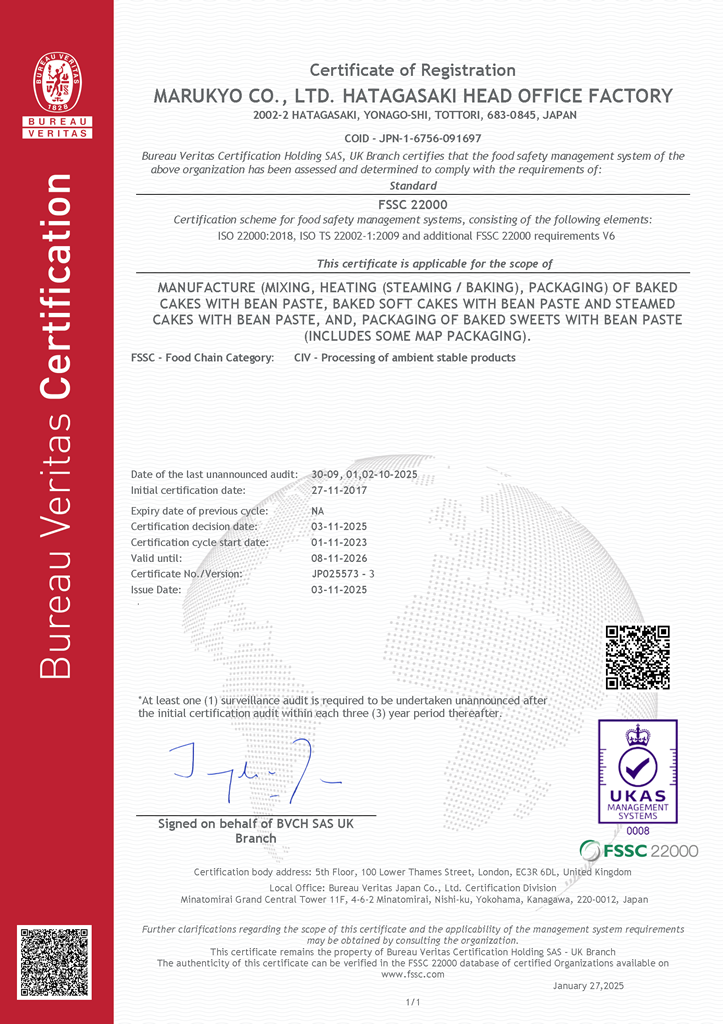 丸京製菓は、このFSSC22000を2013年4月に認定取得いたしました。これからも世界一美味しくて、安心安全で、高品質のどらやきを極めるため、丸京製菓株式会社は挑戦を続けていきます!